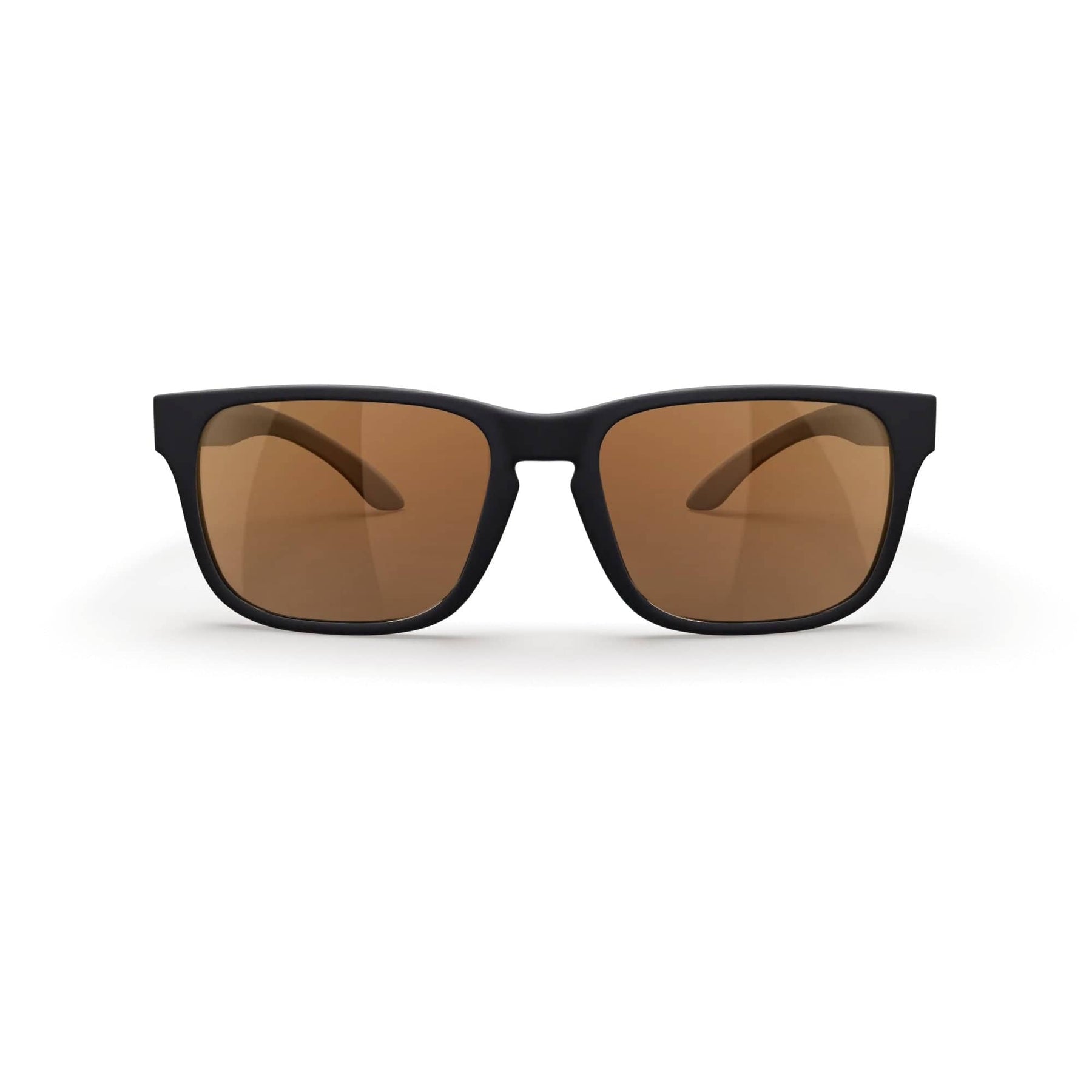 REKS® sport polarized prescription sunglasses with black frames and brown tinted lenses, front view showing sporty design.