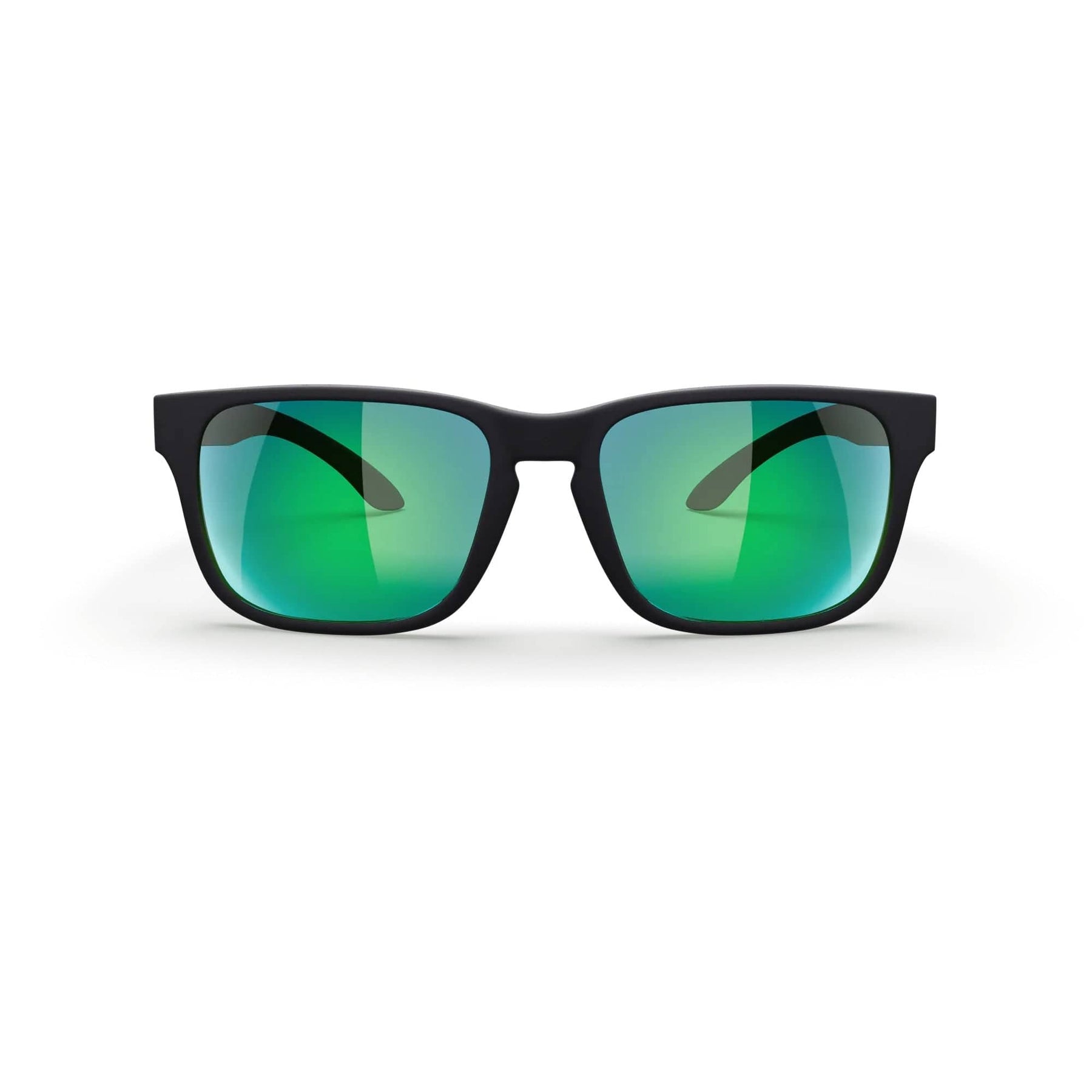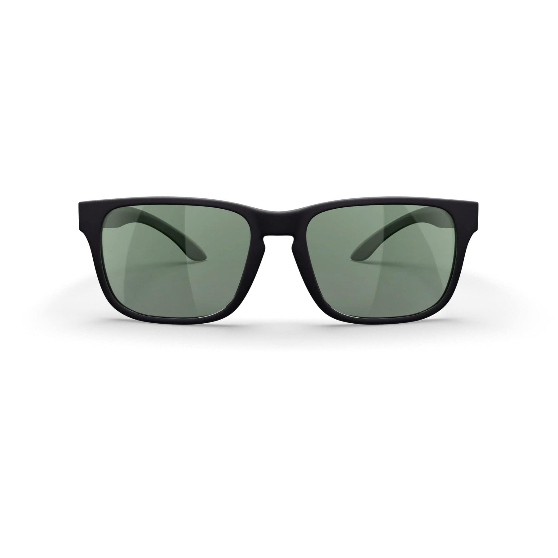 REKS® sport polarized polycarbonate prescription sunglasses in black with green tint, front view showing sporty style and UV protection