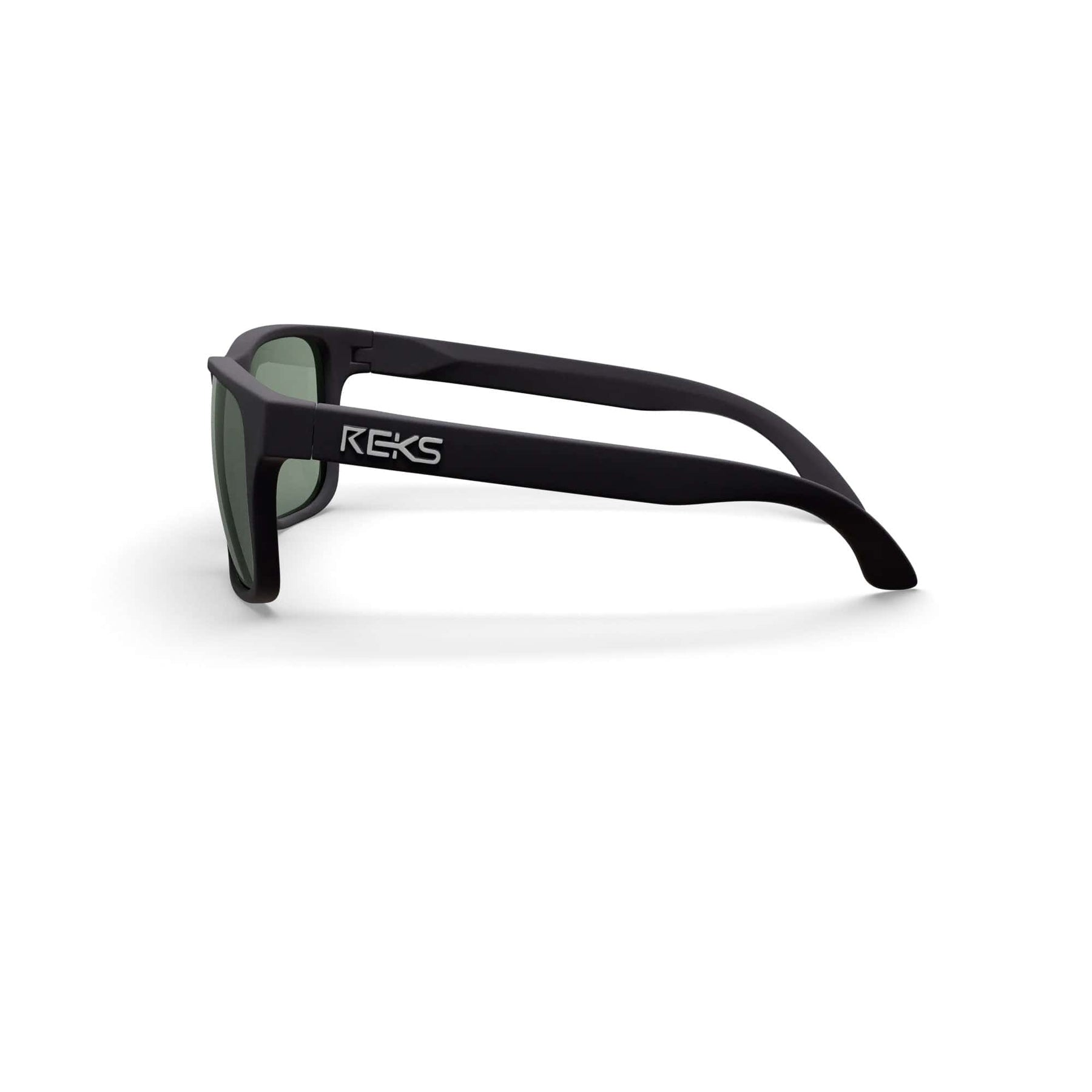REKS® sport polarized prescription sunglasses with black frames, green mirror lenses, side view, designed for active outdoor use.