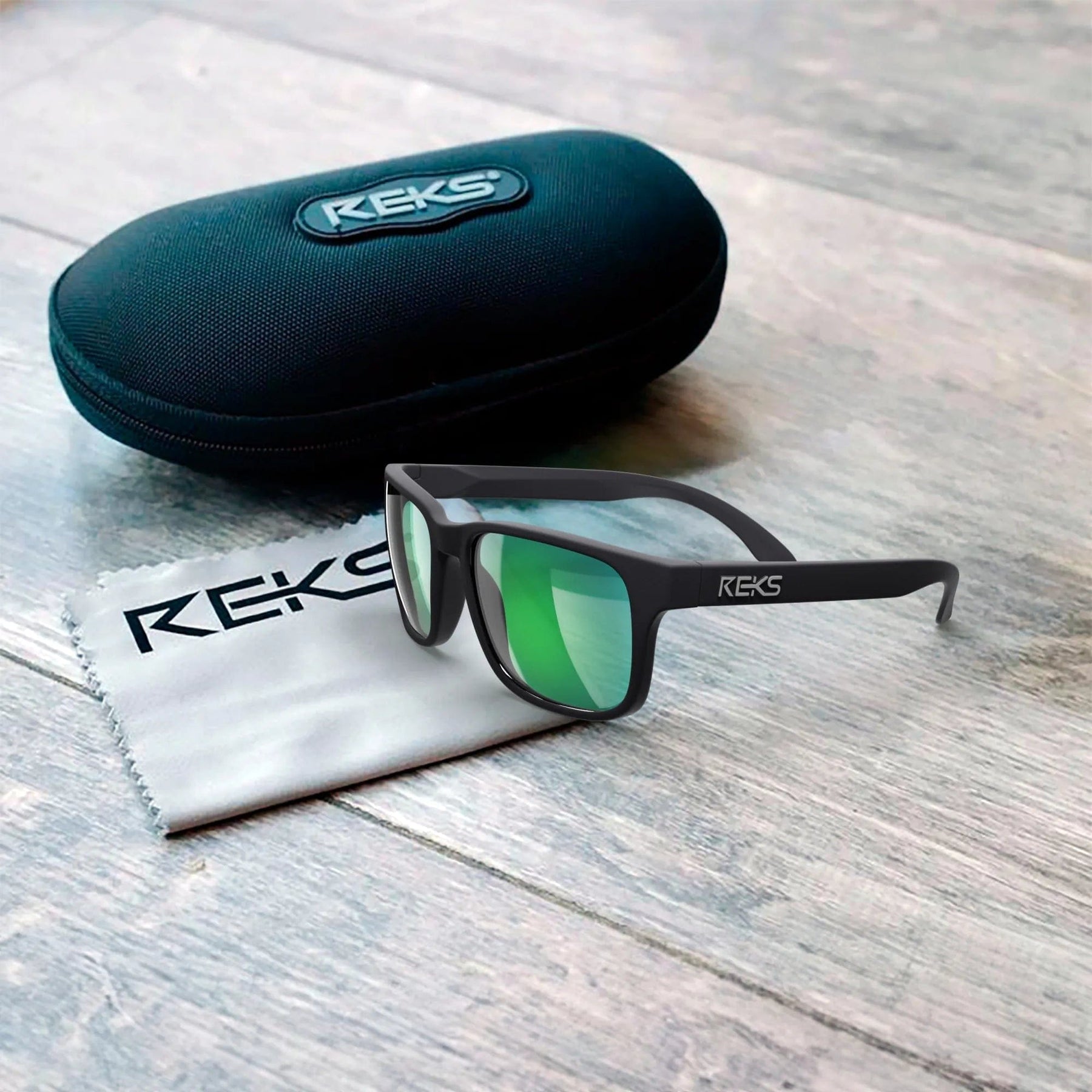 REKS® sport polarized polycarbonate prescription sunglasses with sleek case, designed for outdoor activities and UV protection.