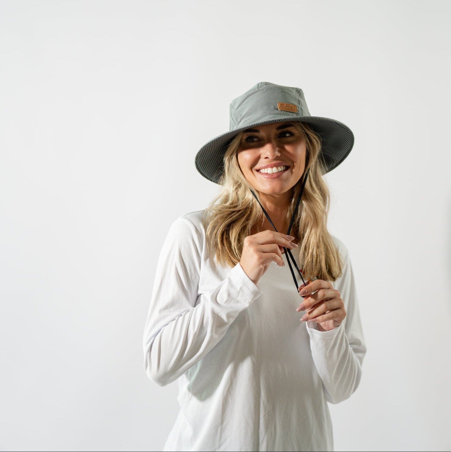 Gray bucket hat by Everglades Fishing Co with a wide brim and casual style, shown on a person outdoors.